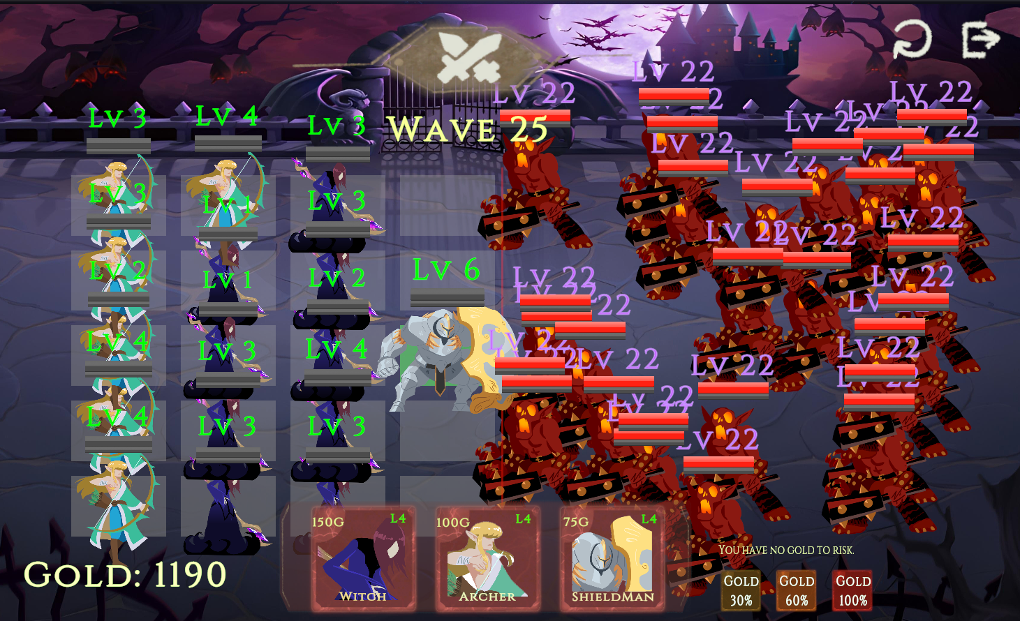 Well that was a fun game! I broke it somehow and now my units are immortal haha (I was clicking the 60% risk button really fast so that may have done it) I like the character designs and upgrading units. Would be cool to see their stats and such. The risk button was pretty interesting as well, I found the 60% to have the best outcome in general. Overall, great job!