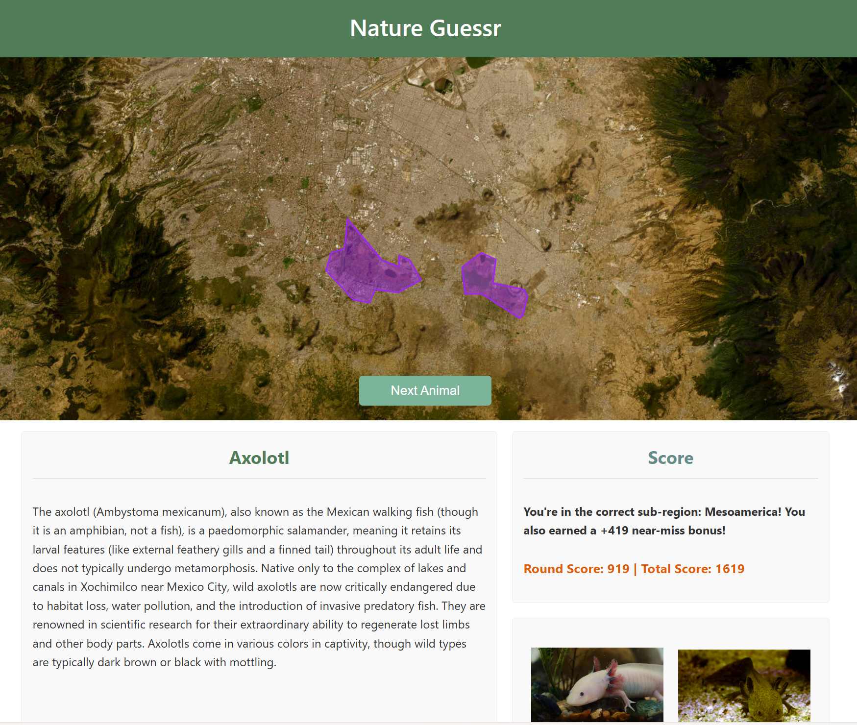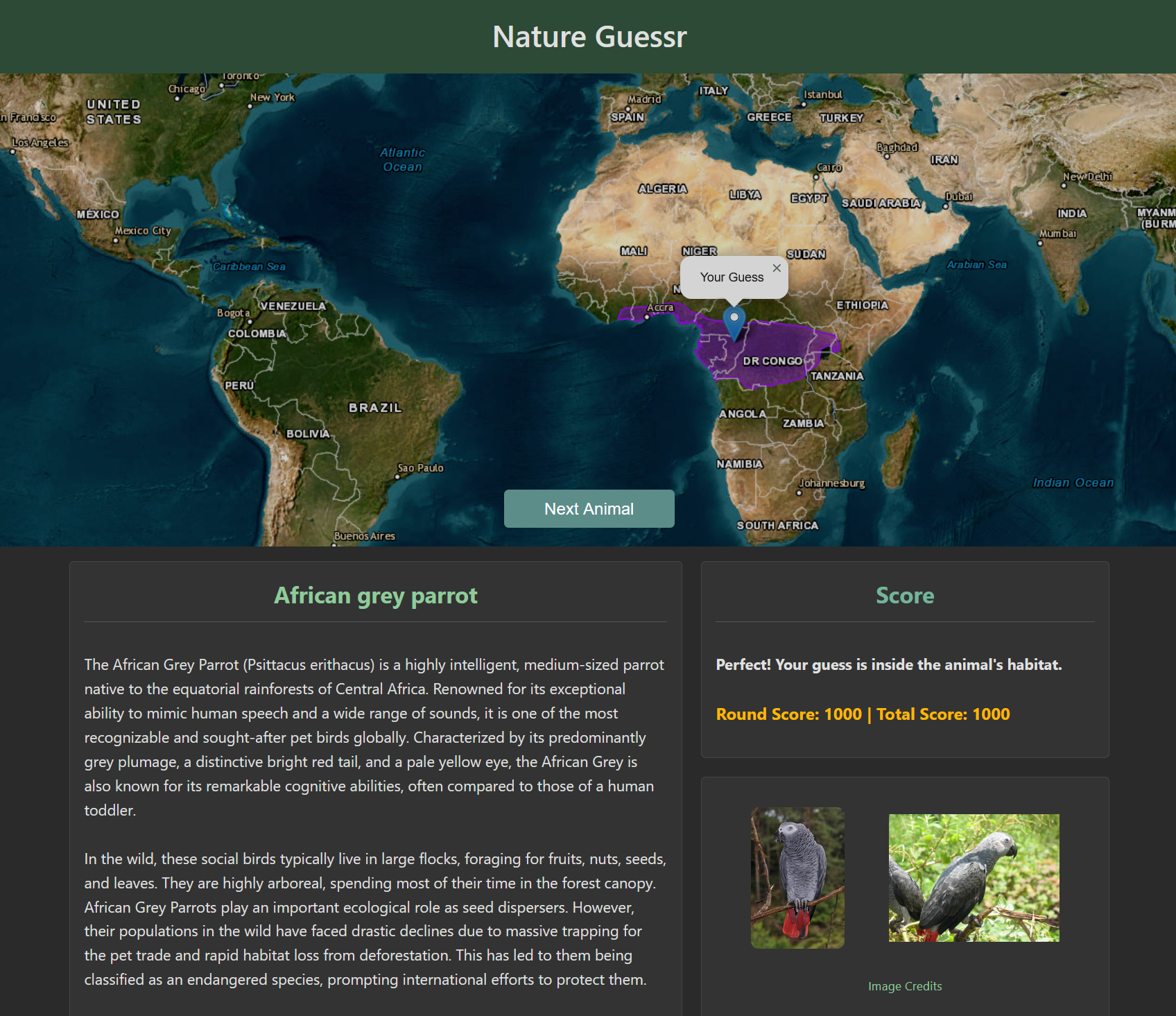 NatureGuessr is a geographic discovery game where your goal is to guess the natural habitat of an animal by placing a pin on the world map.