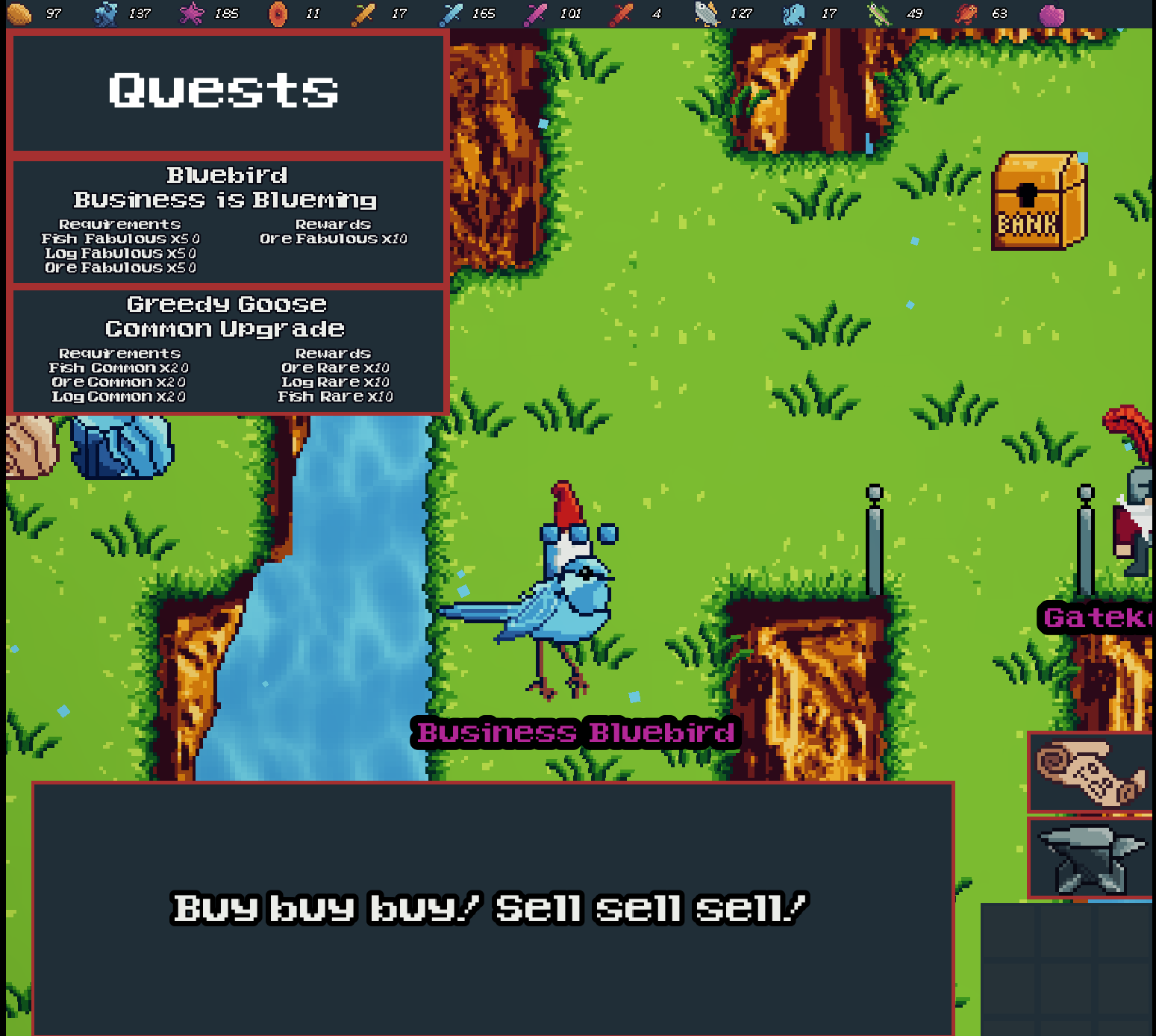 I played this for almost three hours straight on first my run! It's a little grindy, especially from fabulous->fabled stage, in particular because I think I hit a bug with the Business Bluebird: the requirements/rewards seem wrong, and I was never able to fulfill it. That made getting the legendary(?) ore far more grindy as there isn't much of it around the map [screenshot attached]