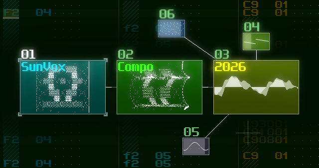 Send your .sunvox file(s) to nightradio@gmail.com with "SunVox Compo 2026" topic. Don't forget to name your project in the SunVox -> Main Menu -> Song Properties. Name format: Author - Song Name