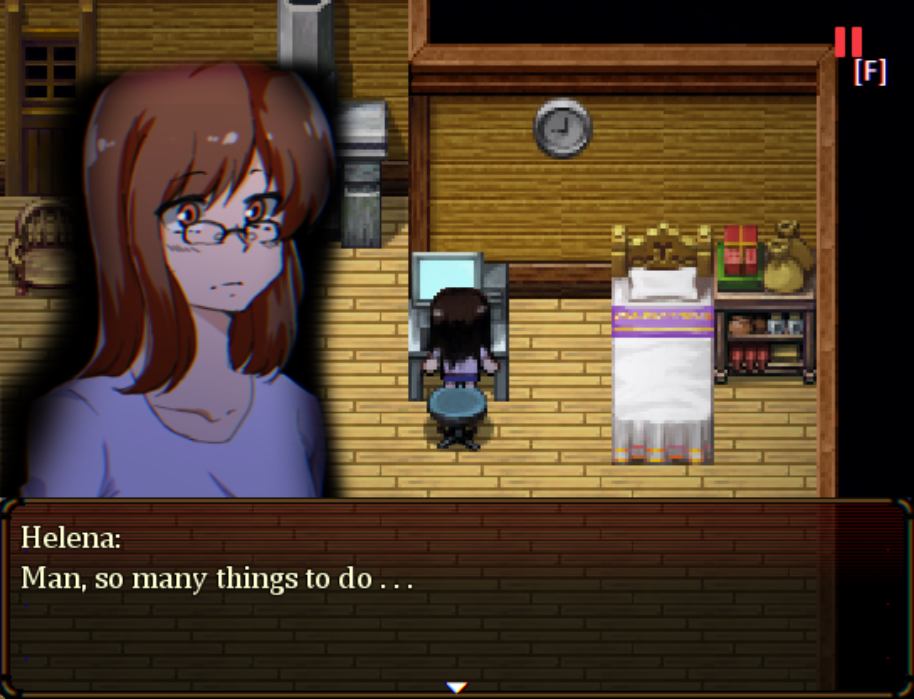they blend well enough when it’s dark/black, though they do could use adjustment to fade or smoothed out more. only Ron’s sprite looked fine to me. - kinda a plot hole i think on the second night, after being woken up by the tv noises which i chose to ignore, followed by alarm to wake up again… Helena said it was morning but right after being prompted to turn off the tv and doing so, she said about going back to sleep? what about work? i thought maybe because she was too stressed out or something but she also said that she couldnt afford to take a day off because of the work pile then also, after hiding from that spooky someone, she said it was last night… that entire day she also spent not going to work since she was in her home, with Ron and everything. im not quite sure if i missed on something connected to that, maybe it was one of strange things happening that messed with the time or it could be a clue of the fake Helena or something?