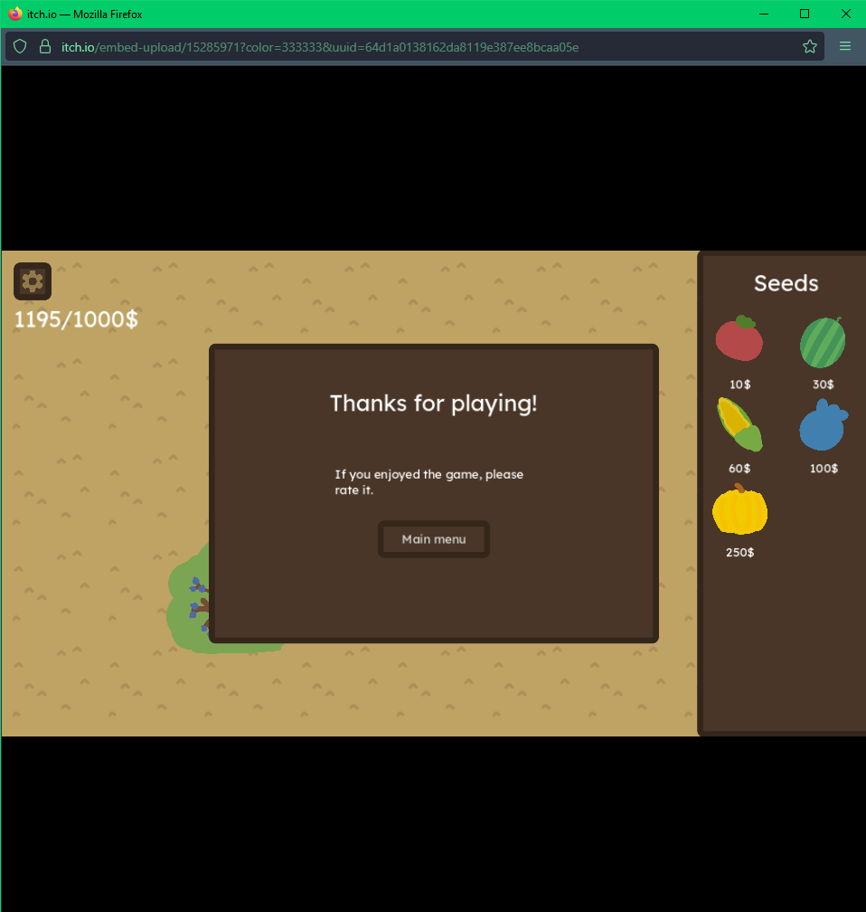 This was a really cozy game! I like the relaxing music and the minimalist art, but the gameplay felt very lacking and i had to find myself go and do something else while waiting for the vegetables to grow. Maybe giving the player some more agency in the speed of the plant's growth would have helped the gameplay.