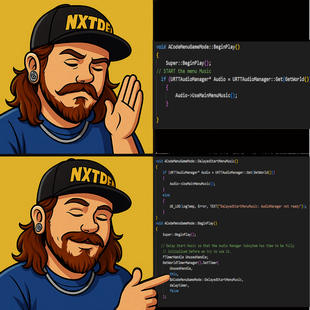 In the end, the simplest solution was the correct one: delay the call slightly and make the audio request only after the subsystem has had time to come online. I wrapped the music start in a private function and invoked it via a small delay (about half a second). That’s short enough that no player notices it, but long enough to guarantee the subsystem exists before we ask it to do anything.