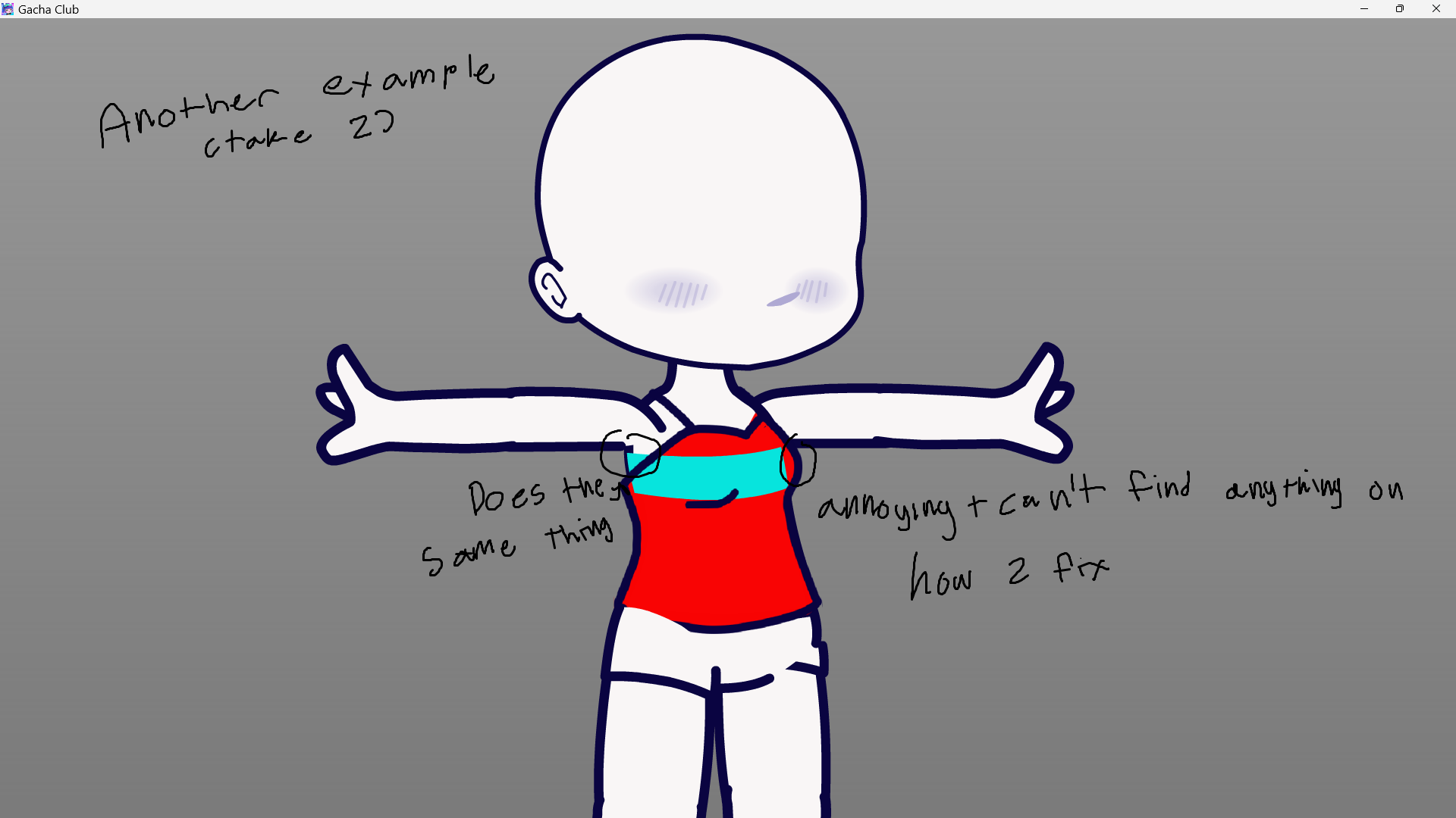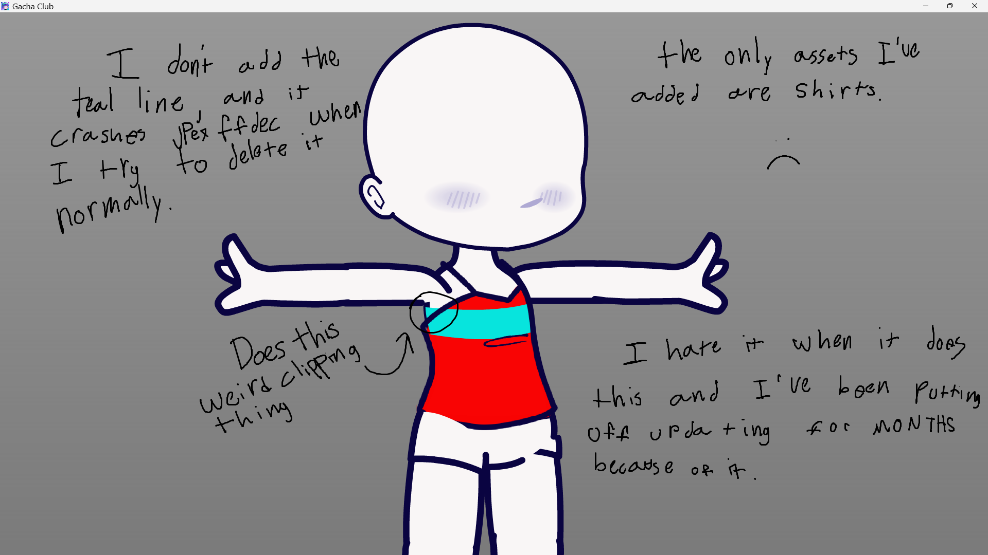 I've tried to find people with similar problems, but i haven't been able to. This isn't a problem with me not doing the process right, as i have followed tutorials very closely and it still does this. I've even tried downloading a different version of Gacha Club and it still glitches. The problem isn't that its adding a new asset, but it's that the secondary colour of the last asset in the original game is getting tagged onto my one-color assets. I've tried fixing it, but it simply won't work. If anyone can help, that would be amazing. Here's some examples below, though.