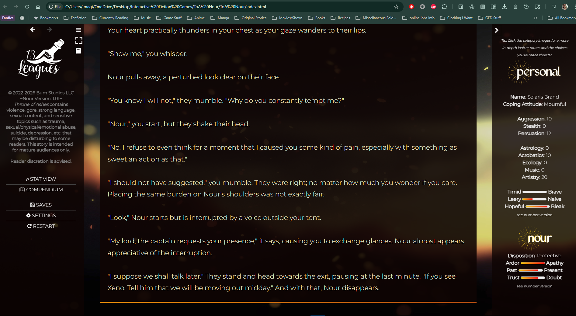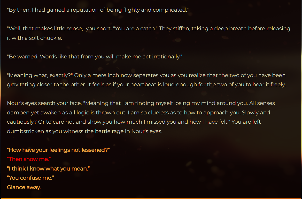 I found a bug in Chapter Four of Nours Route, when you choose 'Then show me' the next page has no way for you to continue. I checked the other choices and they all worked fine it was just that one response it happens with.
