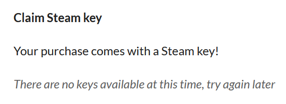 Bought the game (not from the bundle), and the game claims there are currently no Steam keys. Do you know when those'll be resupplied? THanks.