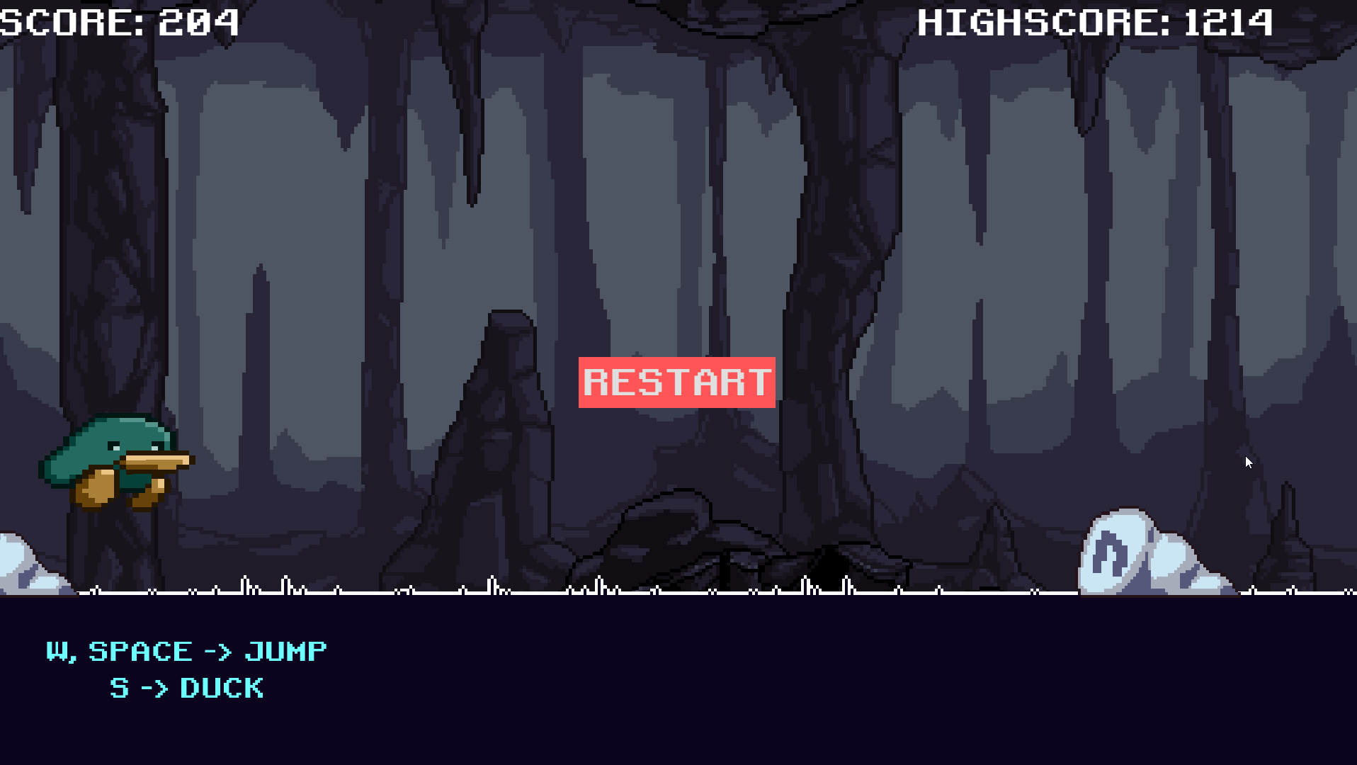 The game is really enjoyable, just seemed like the colliders are a bit unforgiving, I have died in situations I would have expected to be OK. Funny enough, the faster the game goes , the less it becames an issue as the rocks are moving so fast it's hard to jump on them :-) I got to around 9000 points at most and never even had to use the duck, which is disappointing, because the animation is funny :-) Great job.
