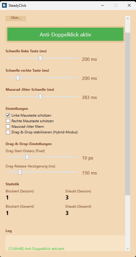 ich möchte euch SteadyClick vorstellen – ein kleines Utility für Windows, das ungewollte Doppelklicks, Scroll-Jitter und wackelige Drag-&-Drop-Bewegungen filtert. Ideal für kreative Arbeit, Office, Gaming oder ältere Mäuse, die anfangen zu spinnen.