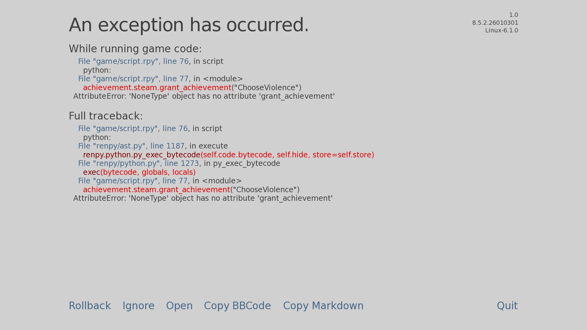 Hi Linux user here (Debian 12), I'm playing V0.82 and when I got to the date where they were going to make tomato soup and grilled "cheese", after the hug-greeting it looped back around to the beginning of the game for some reason? So yeah, I can't progress.