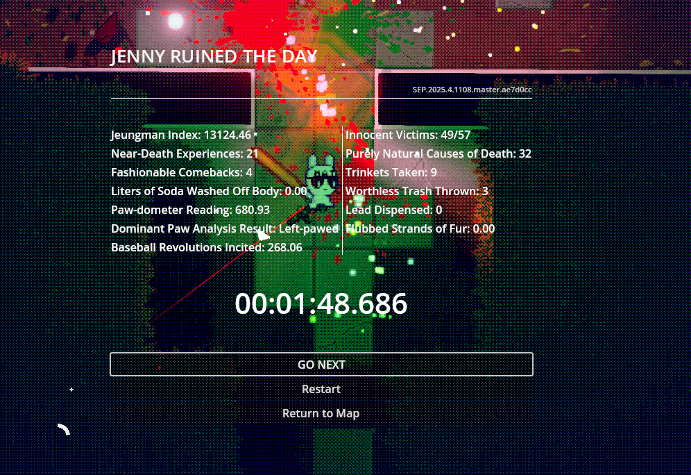 every run ended when the whipladies came out. i assume that's the 'end' of the game at least on that first level? they seem like a brick wall in terms of difficulty spike. their SFX is also much louder than everything else (and a bit grating)