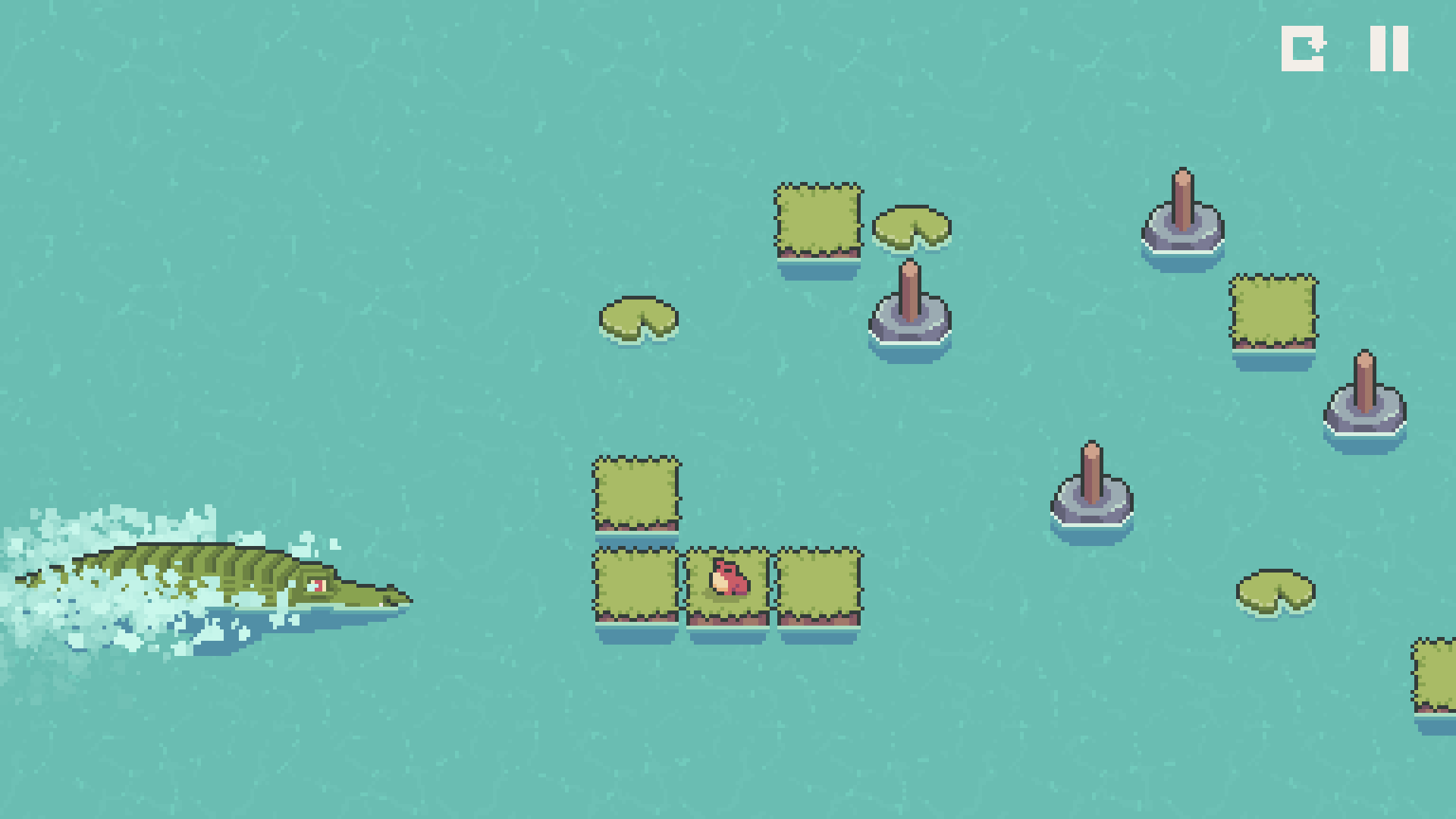 It’s a 2D top-down puzzle game with time pressure, where you control a little frog who must keep moving at all times to avoid being eaten by a very hungry crocodile.