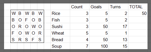 And here's my worksheet where I calculated how to best optimize it. If I could find a way to move things around and add one more Sushi Stand I could get a better score.parchmentEngineer
