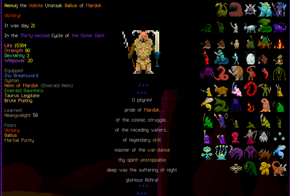 Once you get rolling, you are pretty much invincible. Horror inflicts thousands of stacks of bleed, and Brud heals on attackXbleed/doom/poison. Tengri gives solid dodge bonus per speed. Area attack weapon is nice with astral range bonus. You are attacking all enemies in sight, inflicting increasing stacks of bleed as you build up horror form.