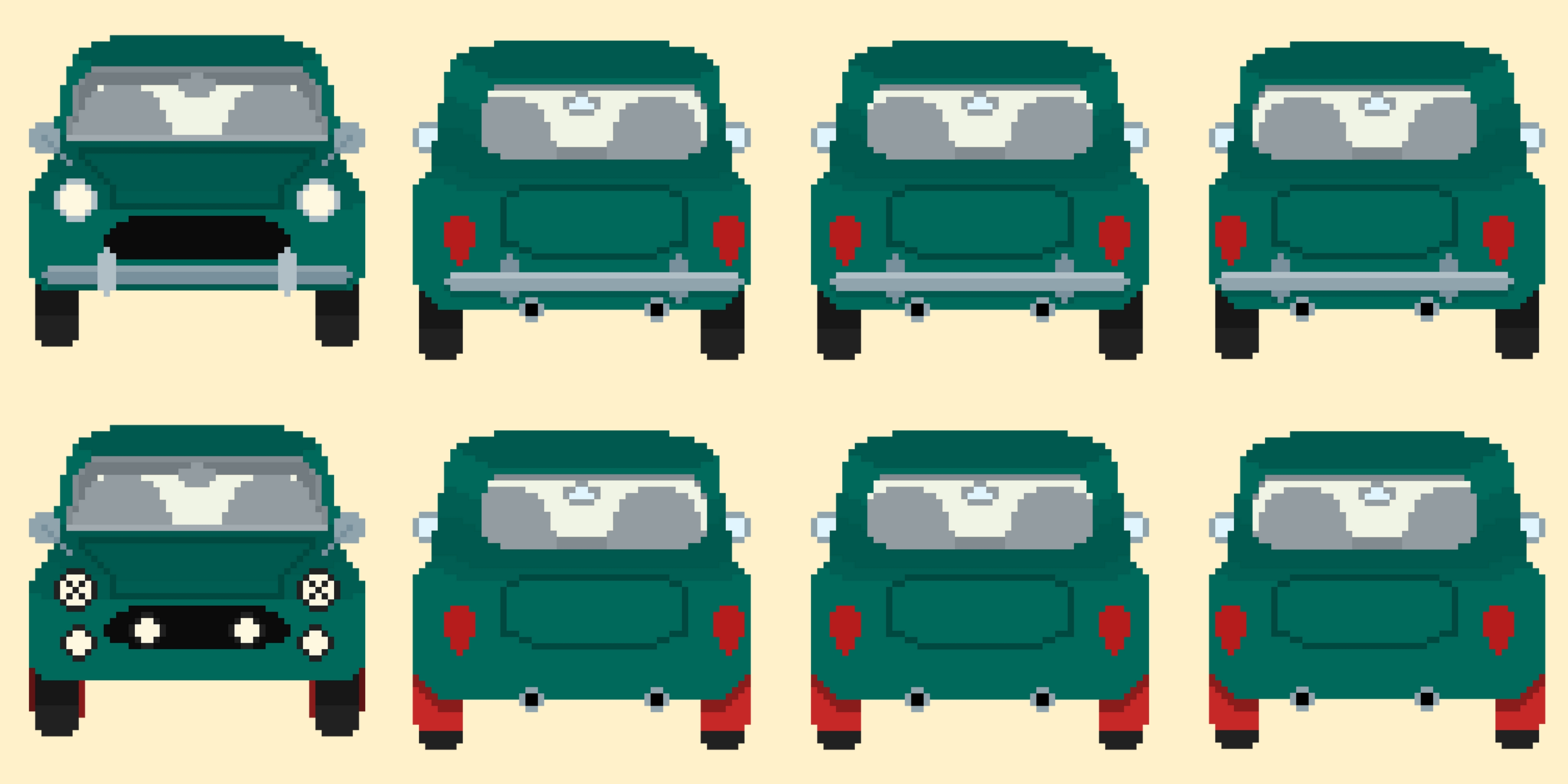 As for offering two variants with different darkness in their glass, it is more of an extra that occurred to me, in addition to the fact that I also got used to some modular sprites that I was makin for a personal proyect, They were basically modular sprites customizable (Front & Rear bumpers, Hoods, Spoilers, Lights, Interior Seats etc...)
