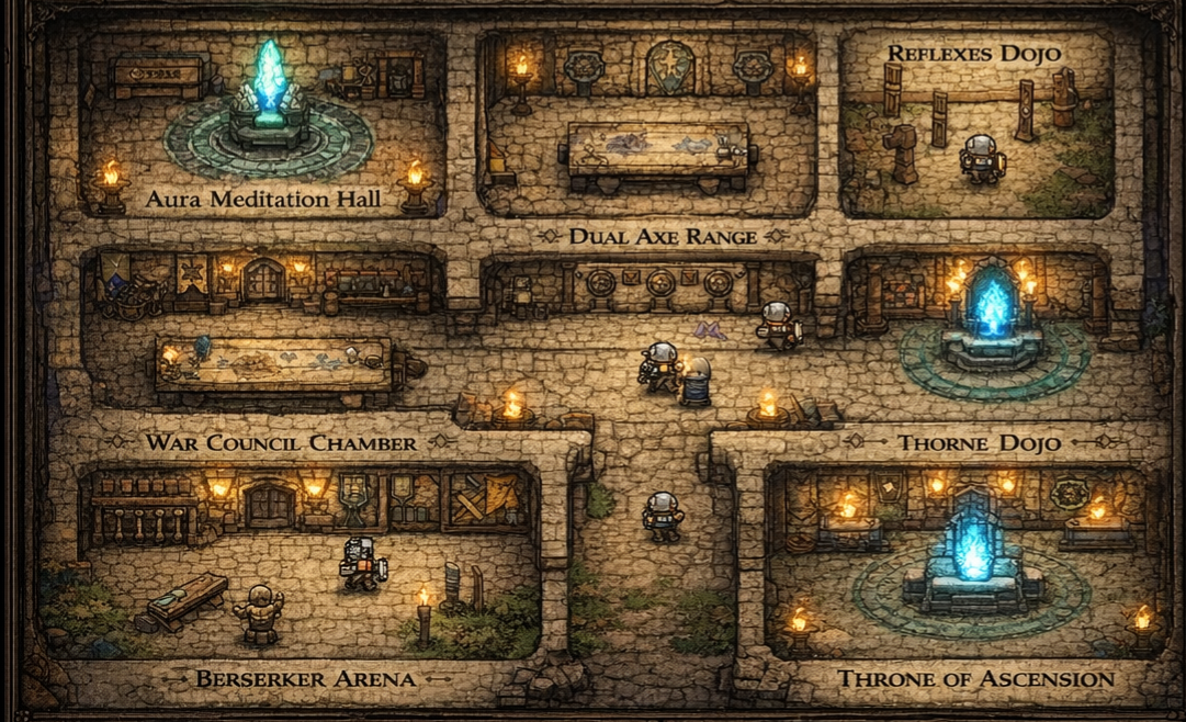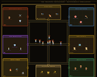 🏛️ Features • 10 autonomous knights with unique rune identities • 7 training chambers that boost different stats • Aura accumulation and chakra gate progression • Leveling system with stat growth • Pixel-art monastery map • Real-time training chronicle log