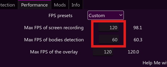 The problem probably comes from the screen recording (The detector fps can't go above the record fps). It's a very simple thread that just use the DXGI desktop duplication and it should request nearly 5% cpu/gpu power. I plan to test a new way to get the screen data for the next update so maybe it will fix your problem.