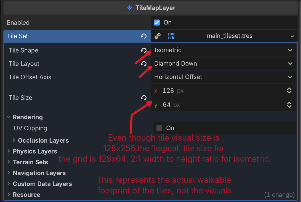 - When setting up / creating the TileSet in the TileMapLayer, set the TileSet properties to Isometric, Tile Size 128x64. Tile Layout varies on your needs I think. Same with Tile Offset Axis. Note that Tile Size here is not the visual size of the tile image, but the 'logical' size of the grid. For isometric a 2:1 width to height ratio should be used. This sets the TileMap grid to the right size to fit the tiles. See attached images.