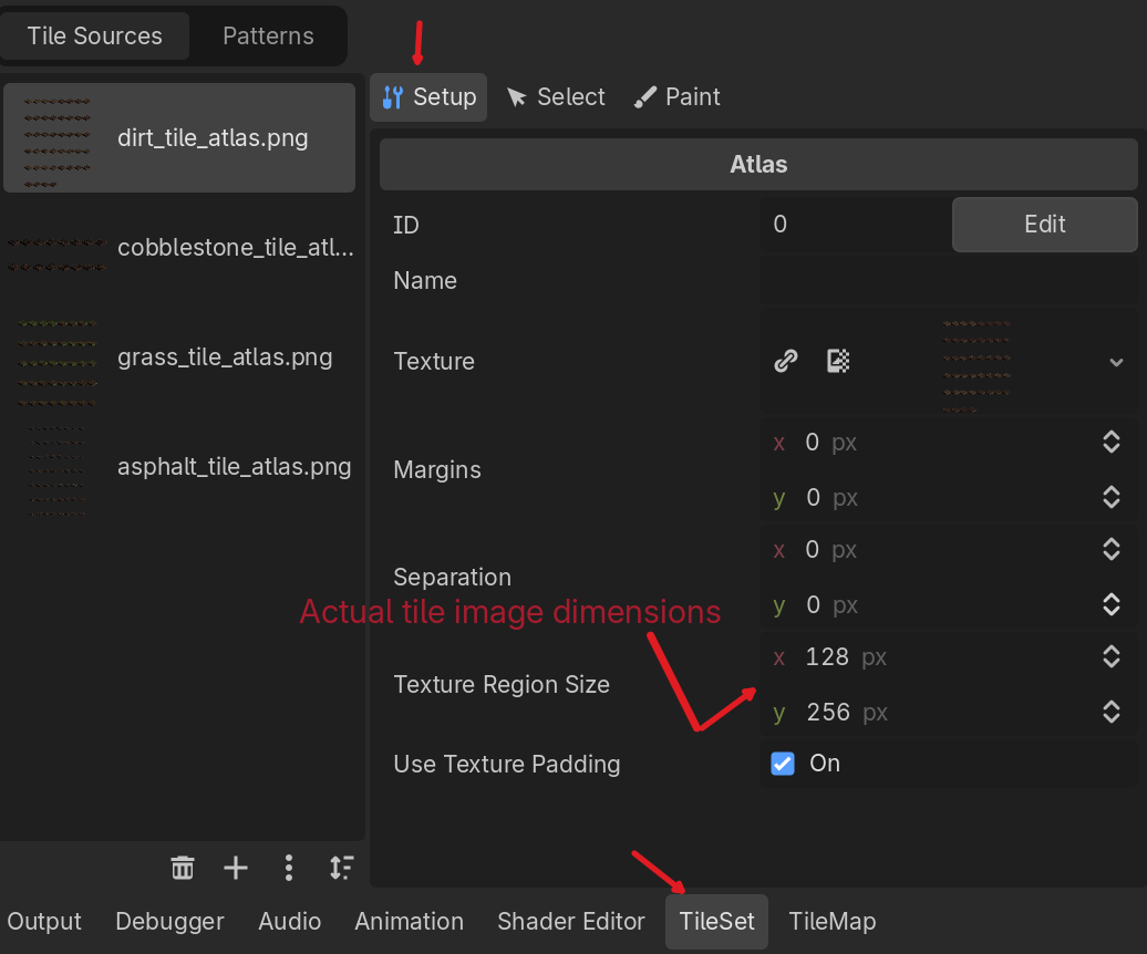 - When configuring the individual tiles in the TileSet editor, in the 'Setup' tab, set the Texture Region to 128x256, the actual size of each tile image. See attached images.