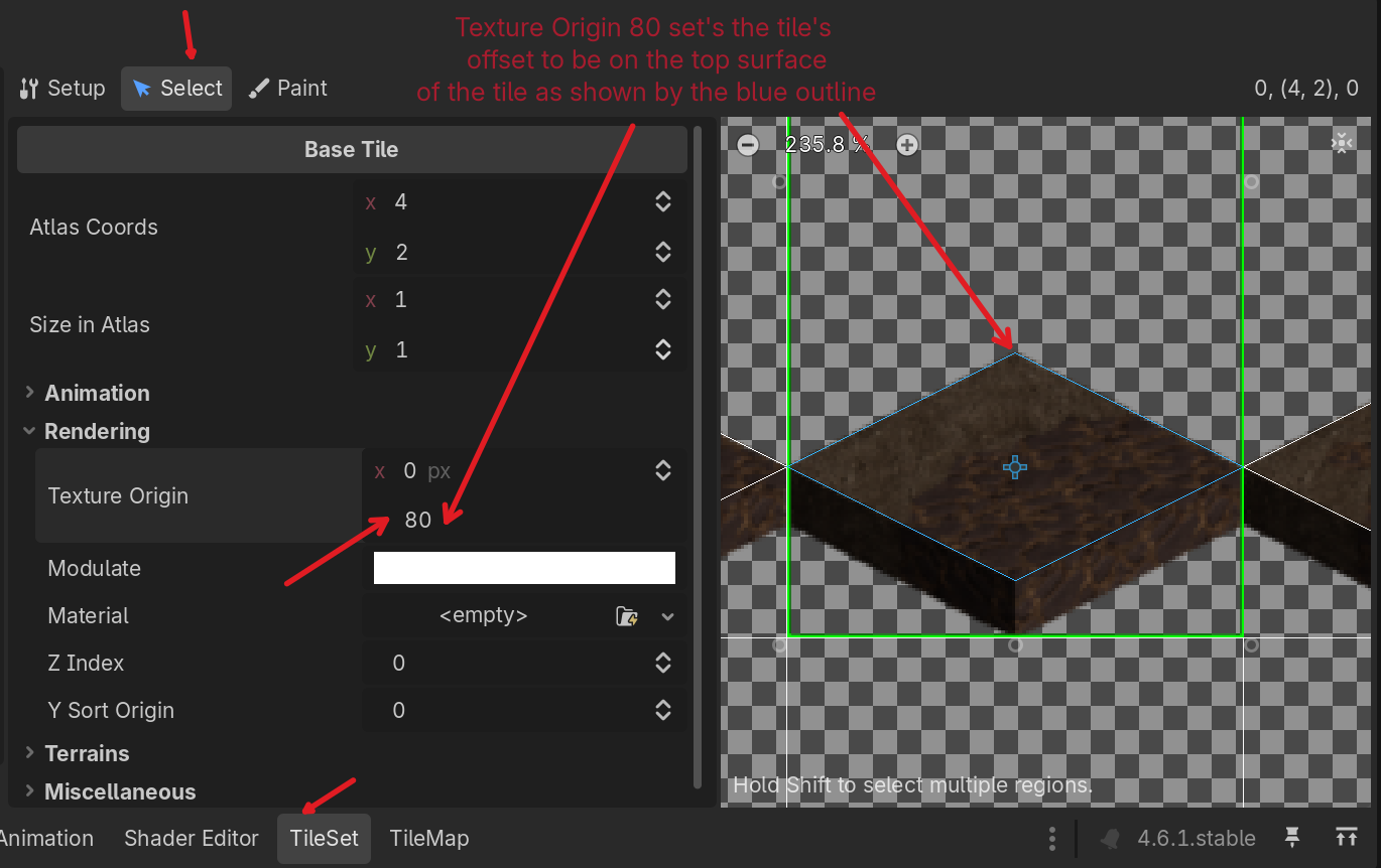 - In the TileSet editor, 'Select' tab, expand the Rendering category and set the Texture Origin to x: 0, y: 80. This configures the tile so the origin is exactly at the center of the walkable surface fo the tile. This ensures that when you place tiles in the TileMapLayer's grid, they actually visually line up with the grid. See attached images.