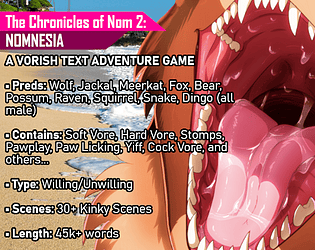 See, my roots are specifically vore stories/vore games. I've been writing vore-oriented stories over on FurAffinity for 8 years now, and that's what my audience expects. I guess I kinda forget that there may be new people discovering my games lol - perhaps should have been more descriptive with what to expect :)