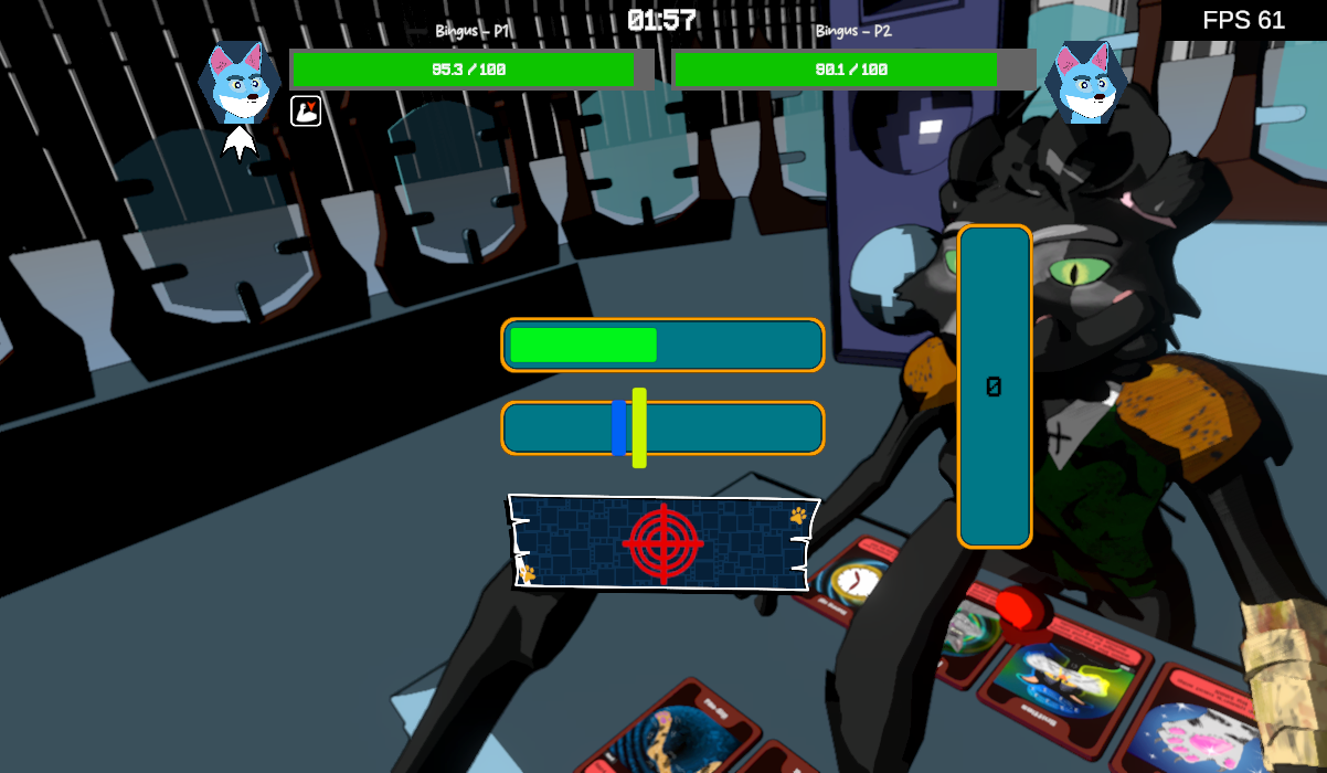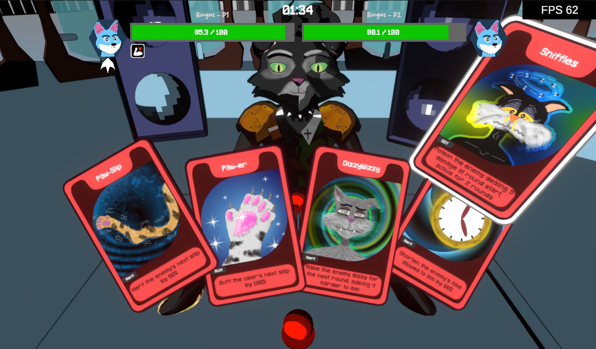 It's a turn-based "slapfighting" game with cards , knockout your opponent by aiming your slaps and out smarting them by using your cards to affect the flow of the match, may the last person standing win !