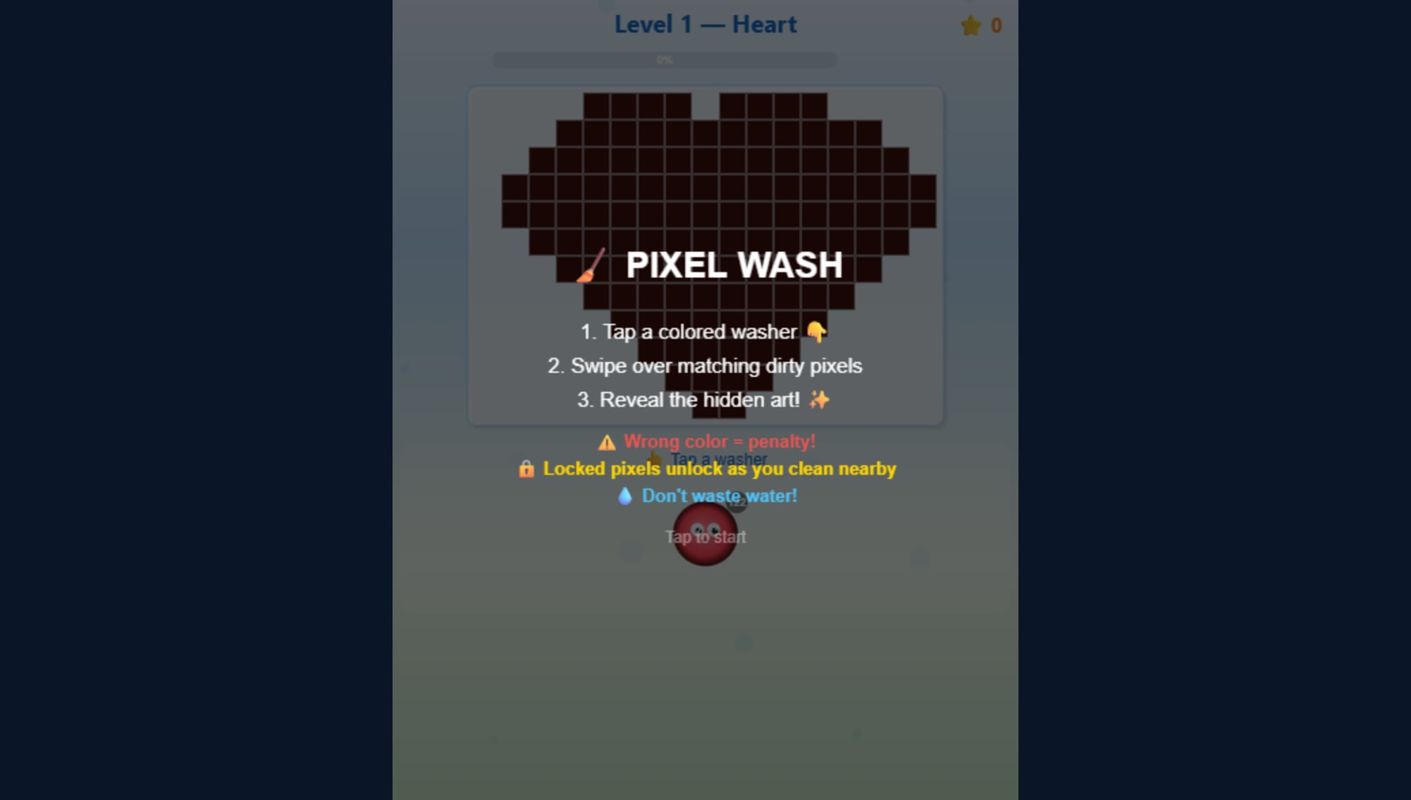 Swipe to clean dirty pixels, but choose your colors carefully - wrong colors re-dirty nearby tiles AND waste your limited water supply. It is a satisfying mix of puzzle strategy and that oddly addictive power-washing feeling.