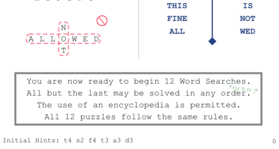 - As you said, teaching about the hints on the bottom is super important. They help with puzzles 1 and 3, and make the word list order feel less arbitrary. Some players actually solved the whole book without using the hints, and then were confused and disappointed that they weren't a secret extra message to solve at the end.