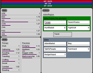 Also, begging was more of a thing I added because it felt funny and sort of right (also toying with the idea of adding "loop titles" just so you can be a beggar in a live, and you get treated poorly by guards). But I guess it's currently not very viable.