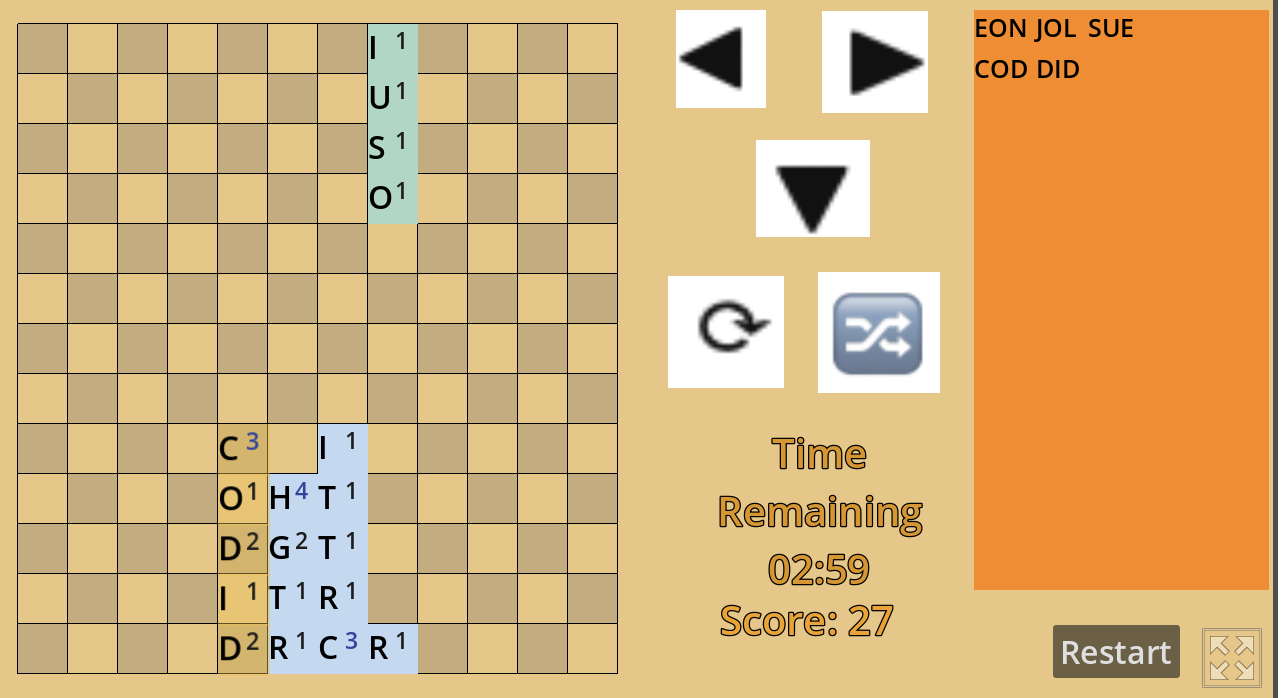 Create valid words (3 letters or more) horizontally across the board to score points. Each letter has a value based on their value in Scrabble. The valid words are taken from the Scrabble dictionary. Valid words are highlighted in gold and shown in the gold box on the right side of the screen.