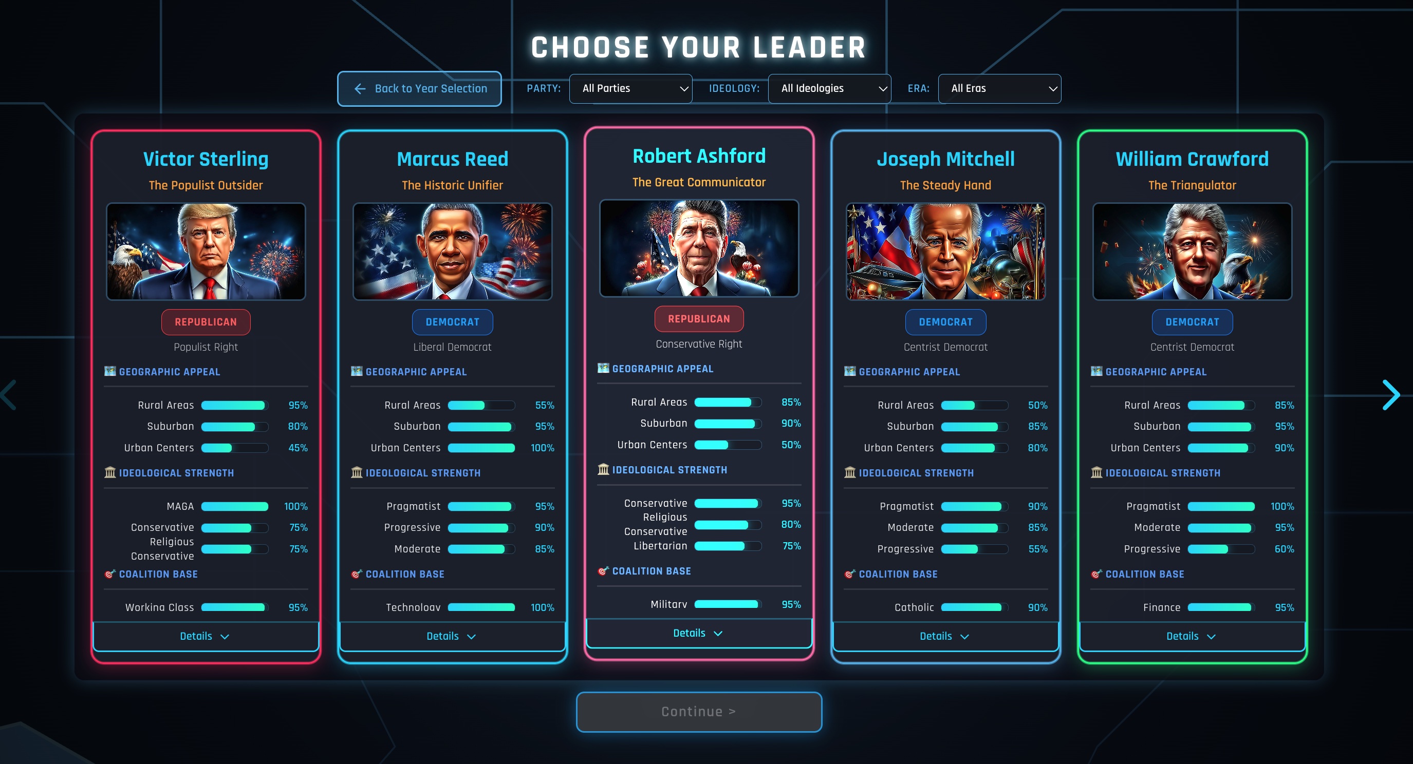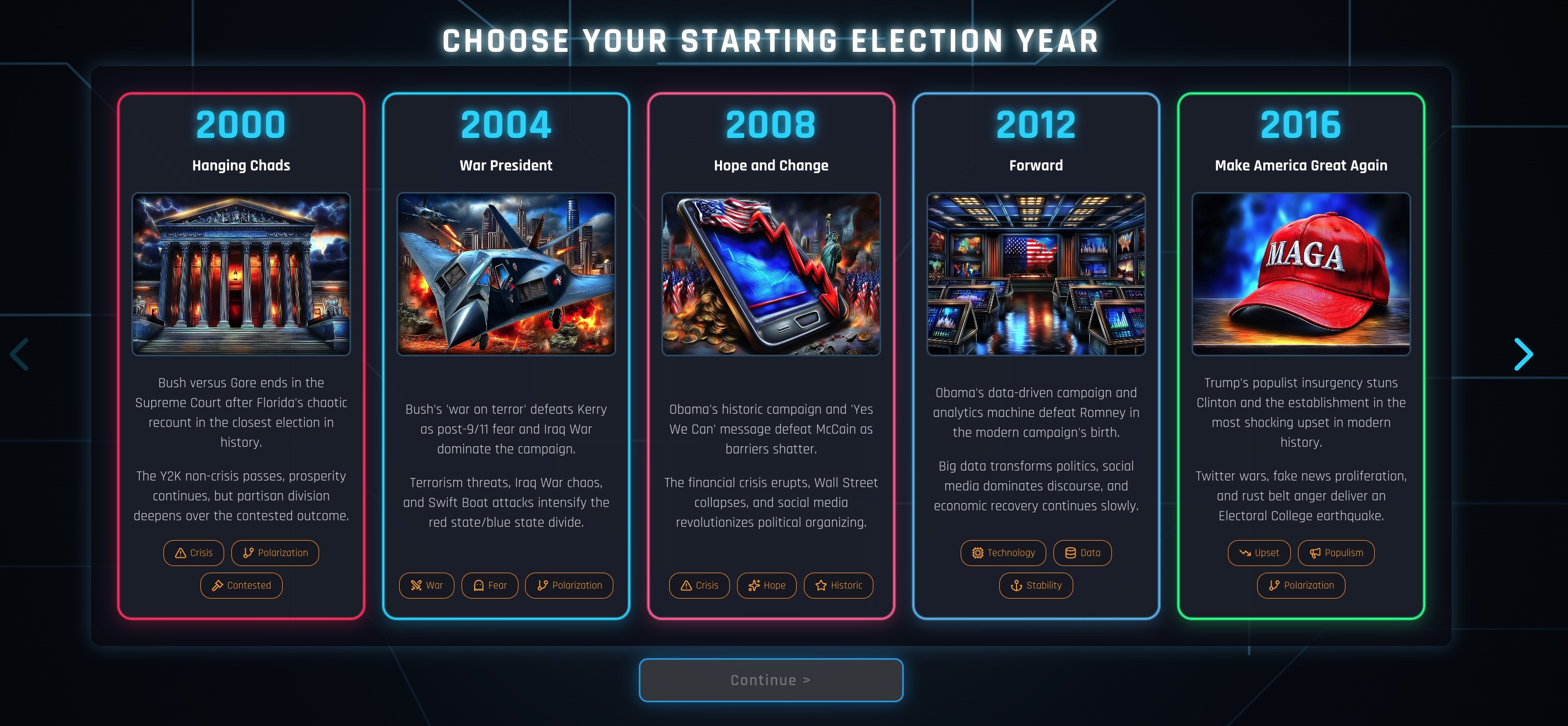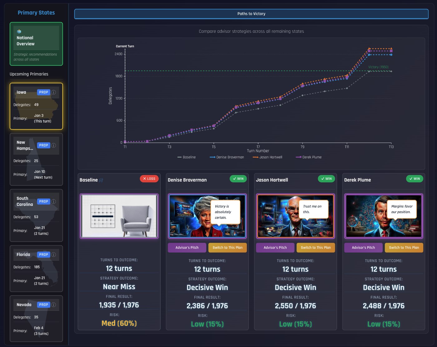 - 7 Campaign Eras - 2000, 2004, 2008, 2012, 2016, 2020, 2028 (with AI advisor twist)