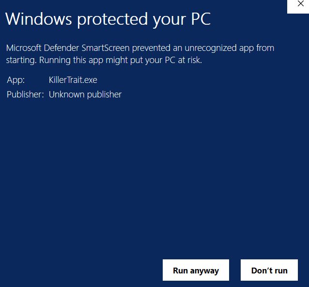5. It's very possible that Windows Defender will see the file as a threat. It's not, so don't worry. Click on "Run anyway" and this should open the game for you!