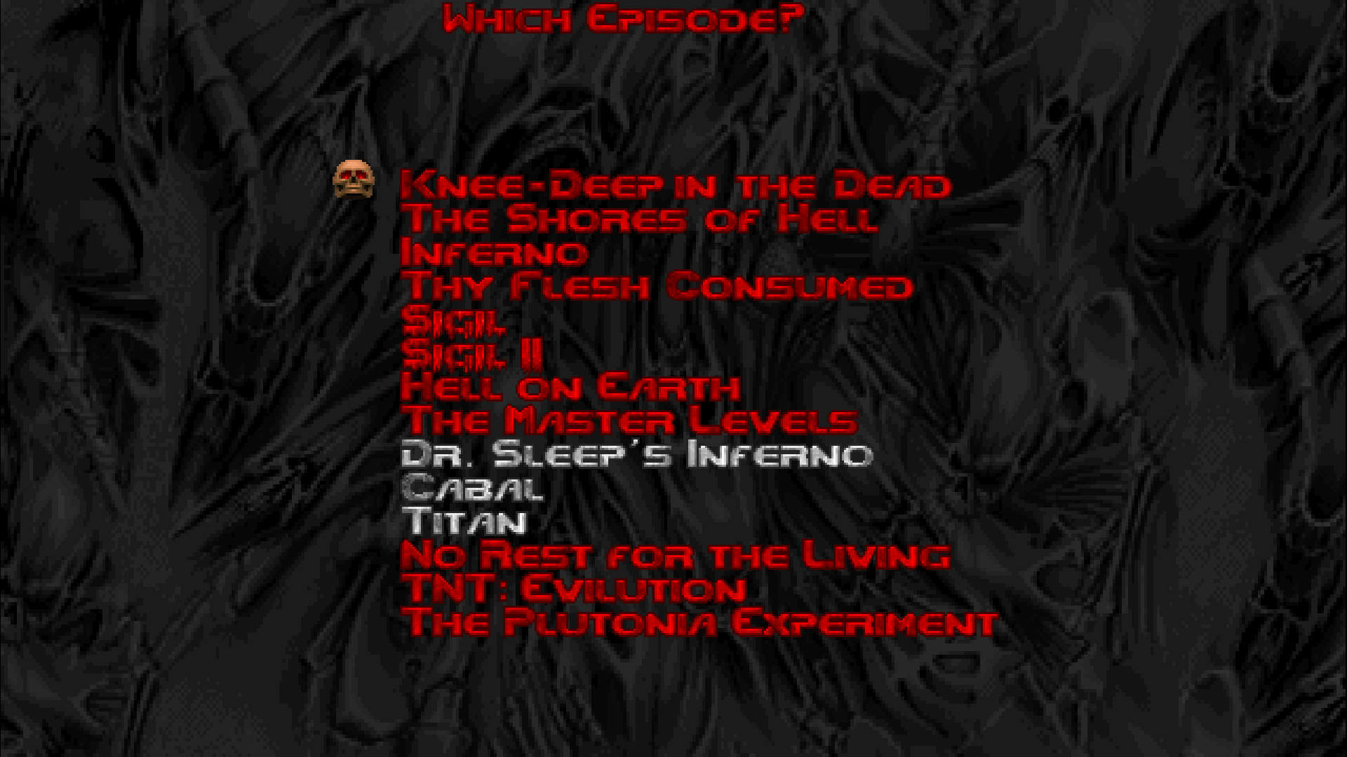 I'm not... super happy that I can't seem to make the title patch go a little lower? But when you're dealing with such a huge list of episodes you do kinda need to make sure you have plenty of room for them all. I could just get rid of the "Which Episode?" heading altogether, it's not like what this menu is for is going to confuse anyone who plays it (just me), and technically most of them aren't really "episodes" under the Doom 1 definition anwyas.