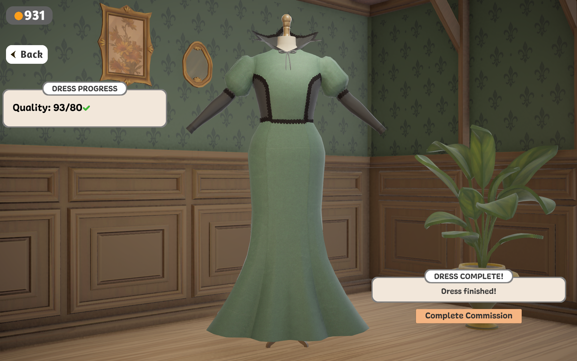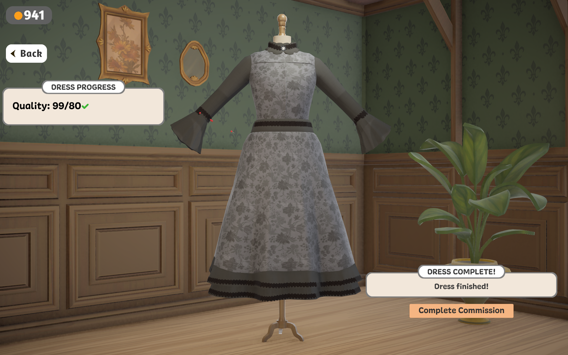 This game is incredibly impressive! I enjoyed putting together all the pieces and creating such beautiful dresses! I can't wait to see more from this game! I'd love to see more pattern choices and accessory options! If I had to suggest anything, I think I would suggest maybe a clearer section for where to put the scissors when cutting the fabric, because I struggled to put them down a couple of times despite thinking I was clicking in the right spot.