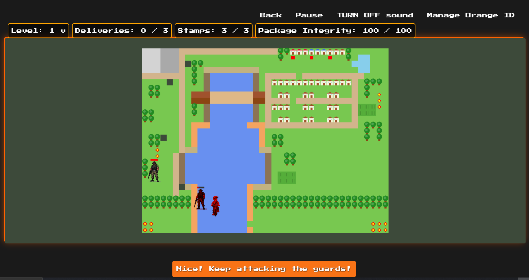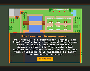 The game is a 2D pixel game about the life of a postman. As a player, your goal is to collect stamps, protect them from enemies, beat the boss, and finally deliver the stamps to the mailboxes.