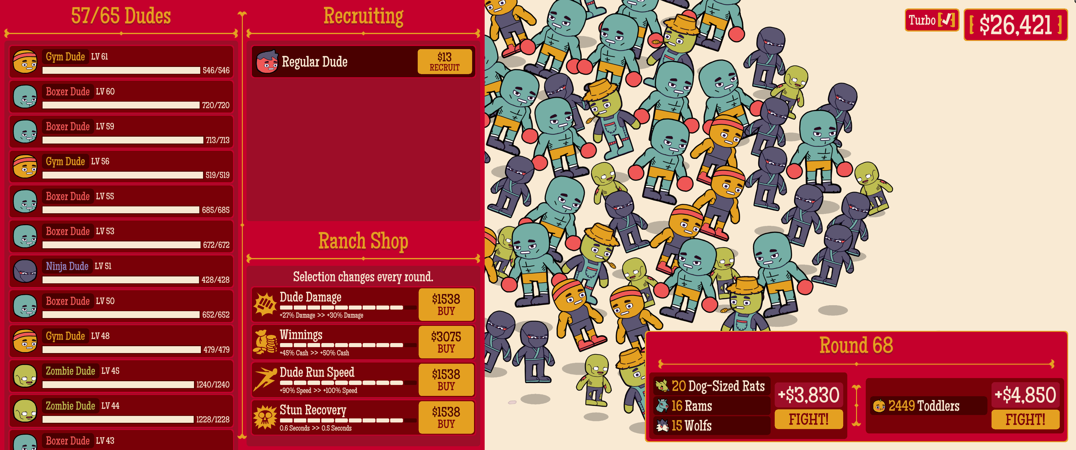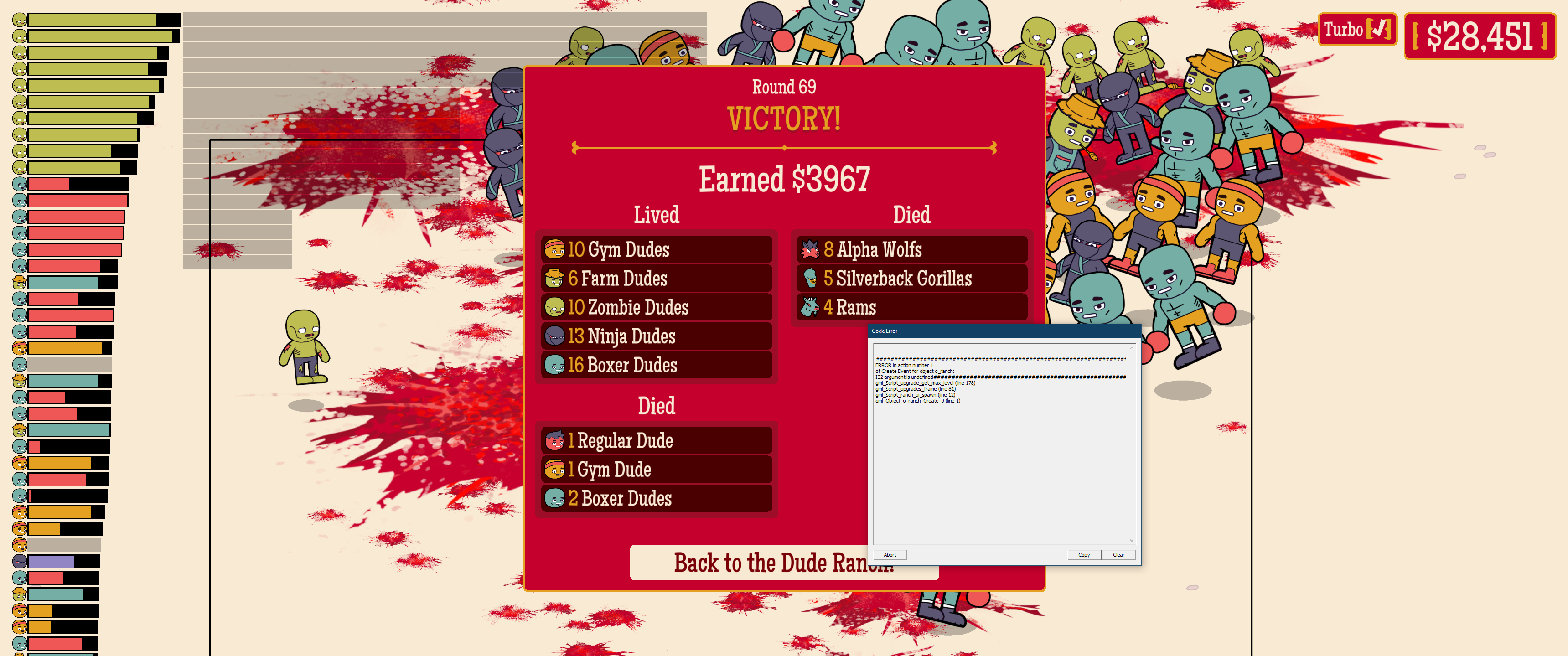 The best game on the jam, in my opinion. Great graphics and music, and juicy gameplay. It's not far from a full-fledged game. I'd love to play the full version. There's just one minor issue: I wanted to max out the game, and there's a problem with the base stats of the dudes. When I max out any stat, the game always crashes. If it weren't for that, I would definitely max out the game, because where else can you fight 2,500 dudes. I have to admit, though, that fight is more like a slideshow XD