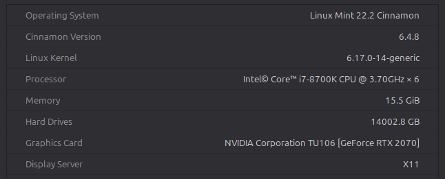 My drivers are obtained via Linux mints built in driver manager. I use the recommended drivers (nvidia-driver-590-open)