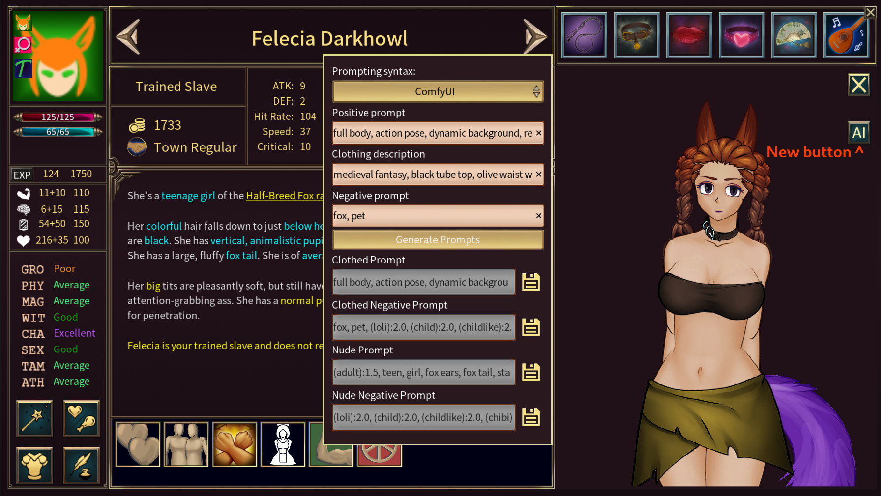 This mod helps you build AI image prompts from character attributes. This mod does not generate images, it only builds prompts to help you do it elsewhere. There are two syntax options: