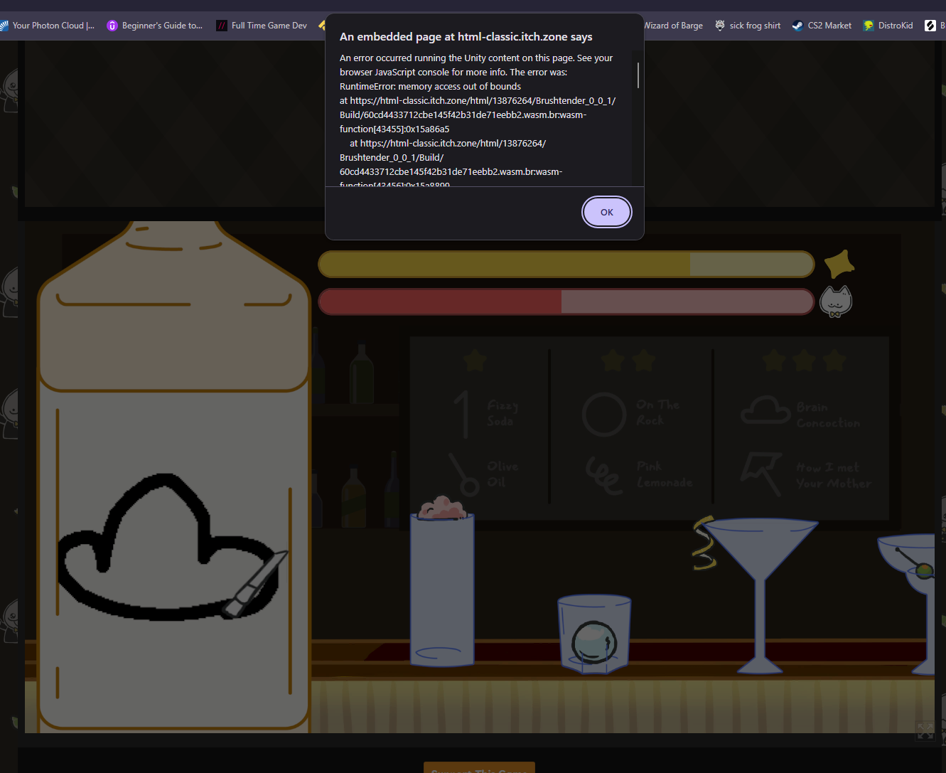 I don't expect you to know a fix for this since it's most likely not happened for anyone else, just thought I'd mention it. I can tell a lot of thought and effort went into the visuals and sound for the game, and this isn't really something you could've found whilst playtesting, so I'm still gonna give the game a super good rating :)