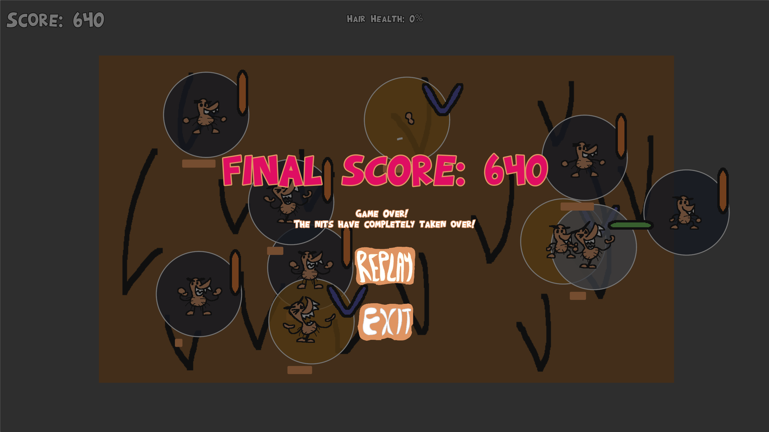 This is awesome! It has a really distinct style reminiscent of flipaclip and old flash animations. As well the sounds and music, definitely suit the cartoonish vibe of the game. The gameplay had me constantly stressing about which bugs were about to bite me, and which one's were more worth my time. Overall an amazing game! I think the only improvements I would suggest is to change the way the nits timer is represented, since them overlapping made it hard sometimes to tell at a glance what timer belonged to which nit (Maybe instead you could have their circles coloured to show how close they are to biting you; green to yellow to red). The only other major issue was that the scaling was a bit off, perhaps due to discrepancies between my display and the display the game was designed on: