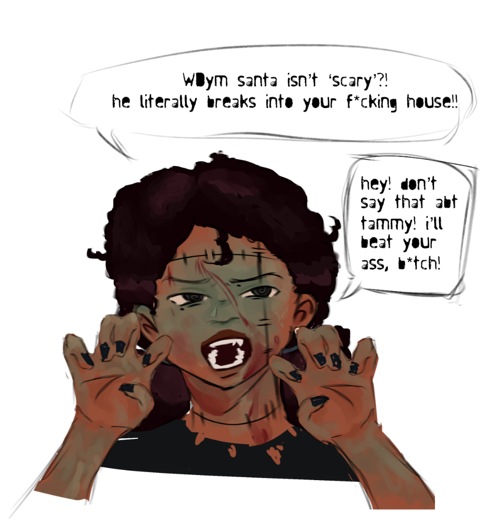 yuming and kojoโs step 1 halloween costume doodles cause why not (YES i changed yumingโs design once again ๐โ๏ธ YES i changed kojoโs step 1 design again ๐โ๏ธ) yumingโs matching w tamarack (santaโs elf) and kojo doesnโt play abt tamarack being santa (heโs a mix of a zombie and a vampire)
