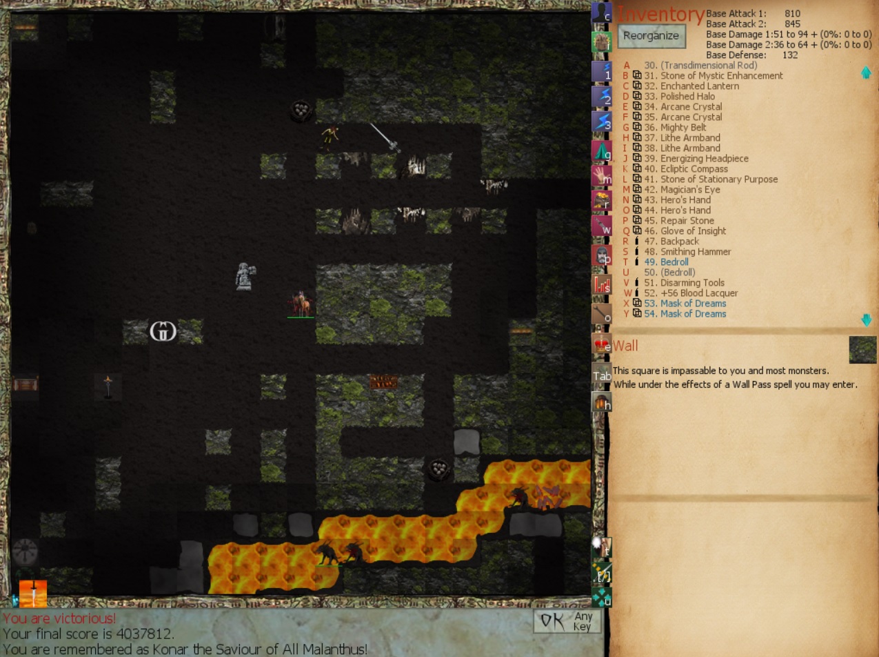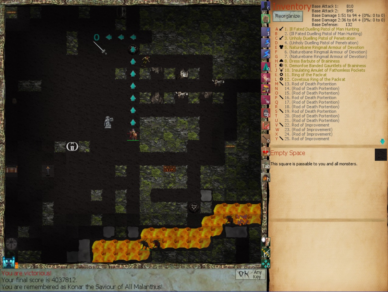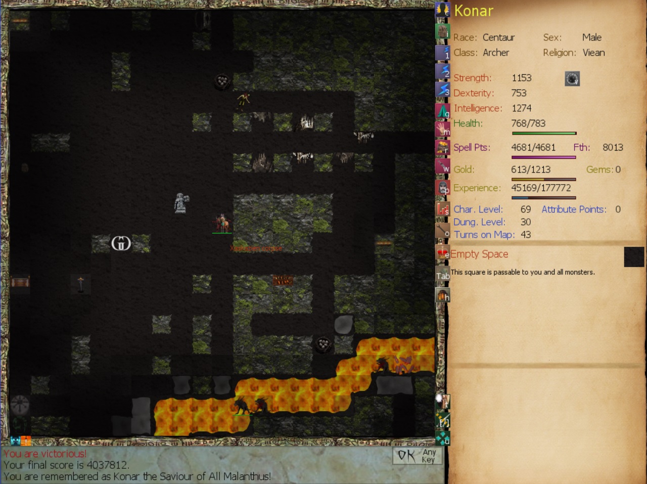 - Would it be fasible to implement a sort of 'morgue' file, where at the end of your run, you have a extensive list of all things you've done throughout the run, rather than a simple high score in the main menu? This way it would be easier to share it with others, rather than having to paste screenshots here.