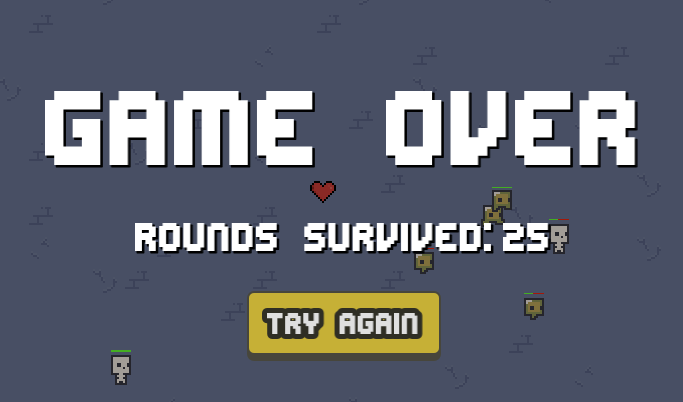 It's okay, I just don't like personally games about minmaxing stats. Enemies create weak dynamics, because they can't surround and corner you. Sprites, which you've chosen looks strange together, i fogot how this calling exactly, but it's connected with different size of pixels of sprites. Also, enemies have another issue - if you will stand at the edge of the map, then enemy can spawn very close to you and you will get inevitable hit.