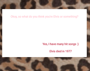 Ps. I like how there's the option to answer people/choose replies. :) I think that aside from the option to enter text (I was going to have an option to name a cat and have the cat's name be referenced occasionally) this has everything. :) In fact, it's probably not worth the hassle of me even trying to figure out the cat thing since I'd probably only be using such a mechanic once or twice. Maybe I'll just have its name be multiple choice! xD