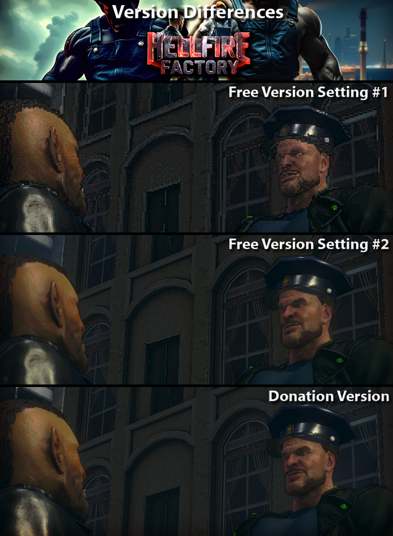 The differences are visual/graphical only, the game content is the same. Please try the free version before getting the donation version to make sure the game runs well on your PC, and that you like what the game has to offer.