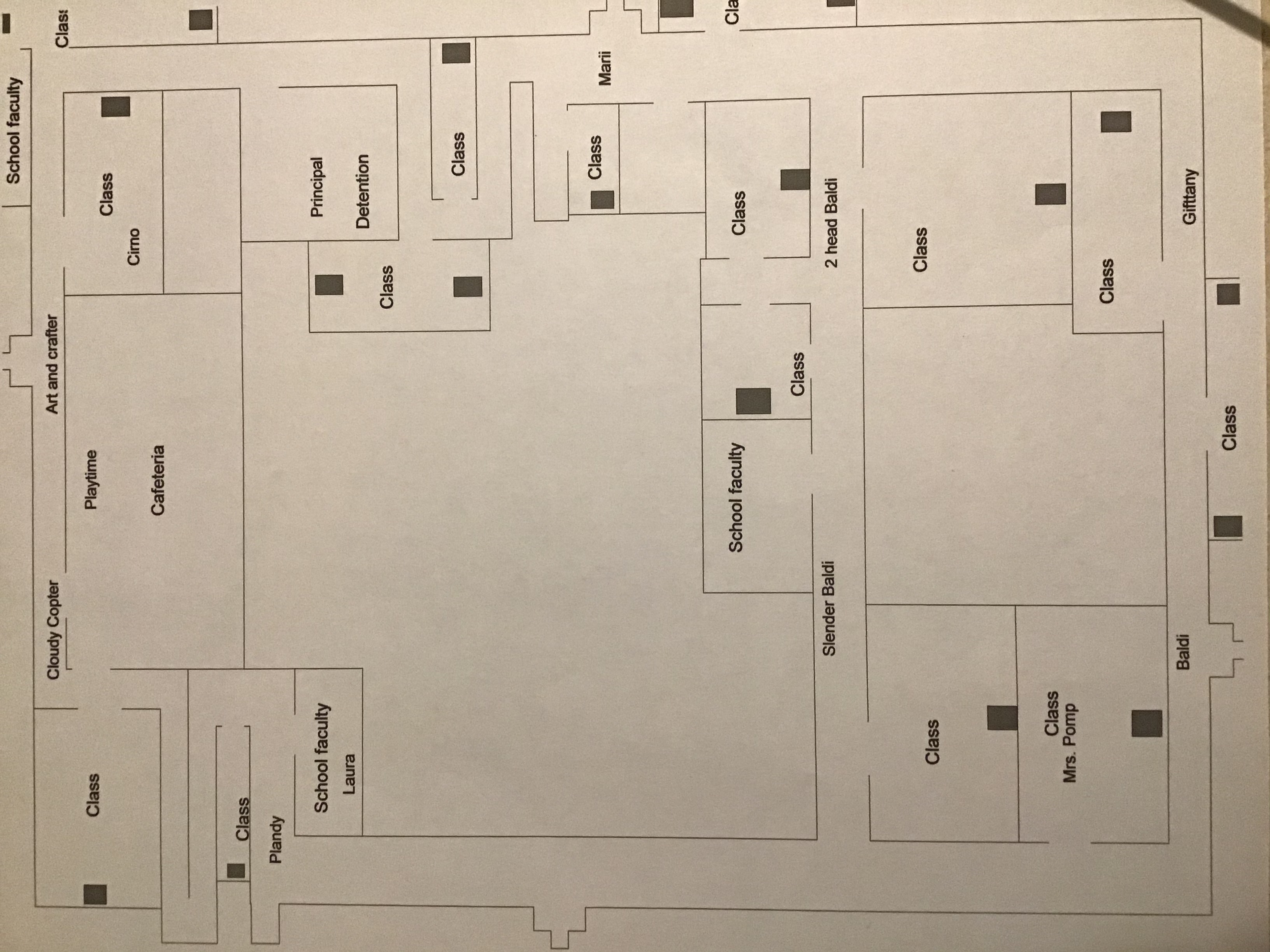 There It is. This is the impossible school. And It has 19 notebooks! Please make this school soon! I know it rotated to the left. But you can turn it around your computer into right. But I forgot to put the question mark on the school faculty, classroom, janitor closet, and a cafeteria! But you can spawn the items at class, school faculty, janitor closet, and cafeteria.