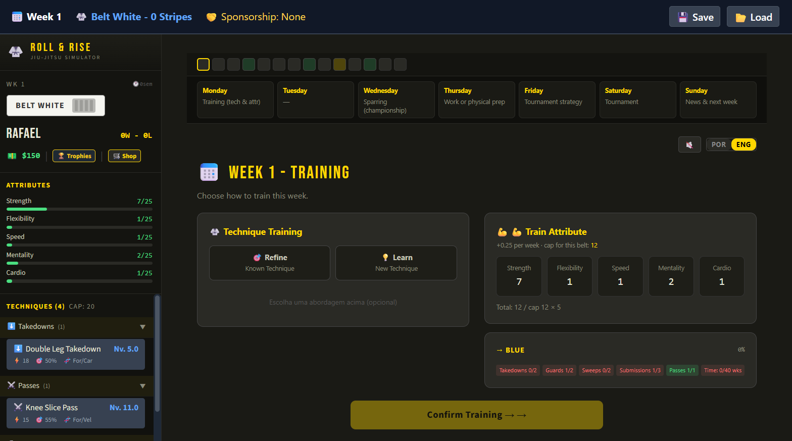The game simulates a full BJJ training week — Monday training, Wednesday sparring, Friday strategy, Saturday tournament — and each decision compounds over time, just like in real life on the mats.