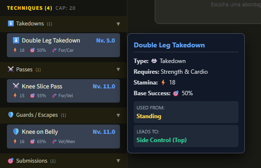 This isn't a game where you click buttons and watch numbers go up. The technique system is built around actual positions, guards, passes, sweeps, and submissions. If you train BJJ, you'll recognize exactly why a Knee Slice Pass favors Strength and Cardio, or why a Lanky body type dominates from guard but struggles in takedowns.