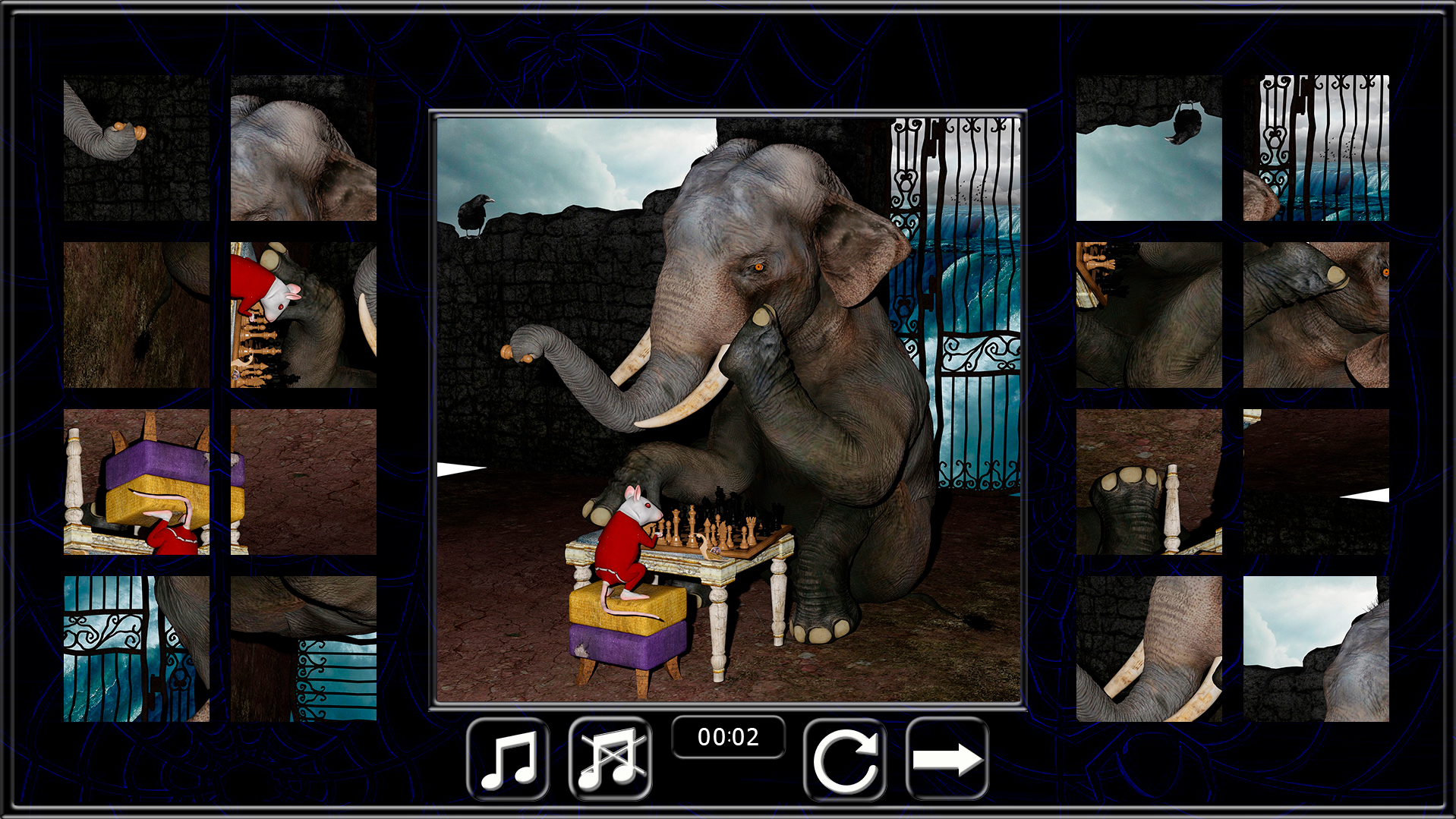 15 Simple puzzles on a mystical theme. Each level consists of 16 elements that must be rotated in the desired direction and dragged into place. At the beginning of the level, you see the image for 5 seconds, and then it disappears. In this version of the game, the help button is disabled, which was in previous games, since the levels are very simple. The game has a choice of levels, and you can start the game from the level you choose. Sometimes a spider appears on the screen that will distract you, you can get rid of it by clicking on it. The game will delight you with nice graphics and calm music.