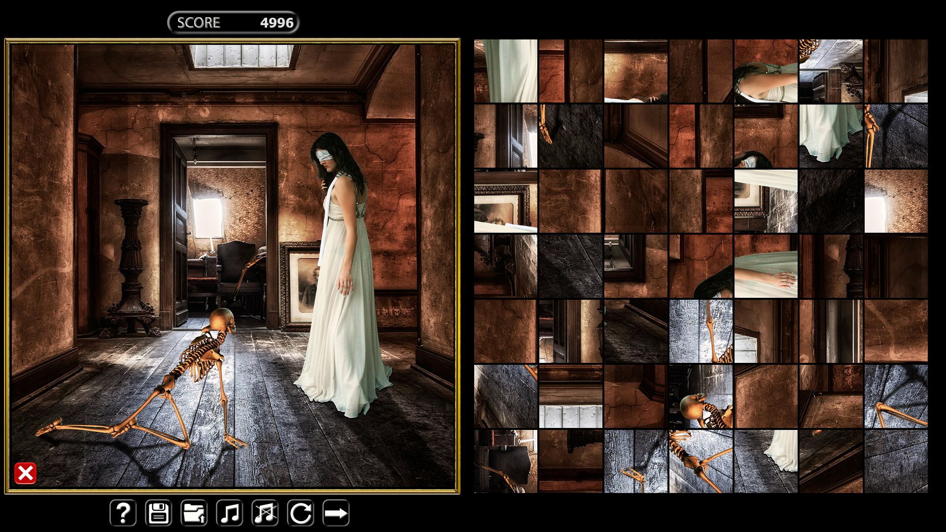 Gloomy picture puzzles. Each level consists of 49 elements that will have to be rotated to match all the elements. The game contains 10 levels of medium difficulty. The game has a choice of levels and you can start guessing at once any puzzle of your choice. The faster you finish the game, the more points you get. If you do not have time to finish the game, you can save it and continue playing at any time, each level will be saved separately. The pictures become a little more complicated with each level. Put all the elements correctly and you will be able to enter your name in the general table of records. If you are at a loss, then click the icon with a question mark and the game will tell you where to put the desired element. In the game, you can flip through the levels without going through them if they caused difficulty in passing, just press the arrow to the right. The game will delight you with nice graphics and calm music.
