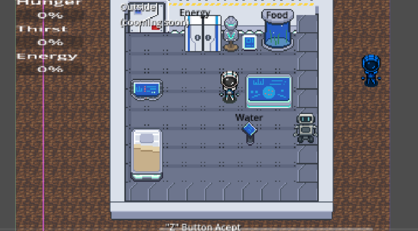 Its a Game about the Eath in year 2080, you must have to survive doing tasks, for now you only can make just that, but in future, i will make things like explore, and add NPC to help you and the Ai will be a kind of evil counsellor... i have no money and time to do it, then if you can support me 0.5 coins helps :)